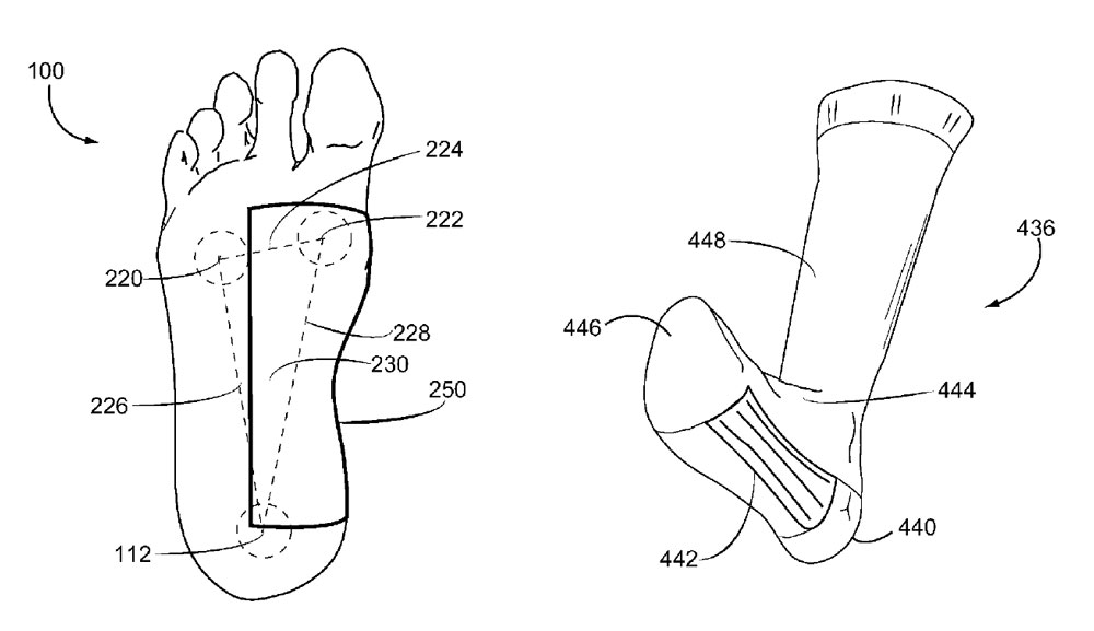 [0040] Sock instep 444 refers to the top region of sock 436 which overlays arch region 230 and arch support assemblage 442 but is not in contact with support assemblage 442 when foot 100 is inside sock 436. Arch support assemblage 442 rests in front of heel flap 440 and behind sock toe 446 and comprises a denser weave than the remaining regions of sock 436, although it does not employ the oft-used terry loops, as the terry loop weave is much better fit for cushioning than providing structural support and stability. Rather, in one non-limiting embodiment, arch support assemblage 442 may employ tuck stitching to achieve a denser weave in which a given sock segment may have multiple rows of stitching overlain. The proposed arch-supporting sock may employ terry loops elsewhere in the sock, where perhaps support and stability are not the goal. Accordingly, arch support assemblage 442 is stiffer than any other part of the sock, though stiffness may vary within arch support assemblage 442 due to differences in strain between parts of the arch. The arch or arch region 230, unless specified as a particular arch, such as transverse arch 224, is to be construed as the region falling on or within the confines of medial longitudinal arch 228, lateral longitudinal arch 226, and transverse arch 224.